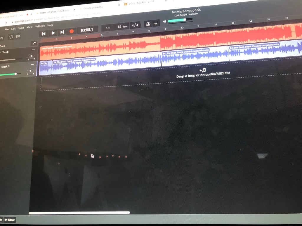 Today all of us practiced mixing the instrumental of a song with the acapella of a different song. The songs I did were She and EARFQUAKE by Tyler the Creator. EARFQUAKE bring my instrumental and She bring my acapella